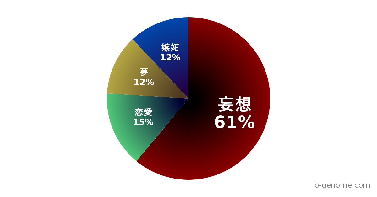 「映え」を重視します。デートコースやプレゼント選びの基準は、SNSにアップした時に「いいね」が貰えるかどうかです。相手との将来を妄想するスピードが光速です。目が合っただけで結婚式場の予約まで脳内で済ませていますが、現実ではまだ連絡先も交換していません。本能のままに恋をします。相手の顔が良いという理由だけで付き合い、中身が合わずに秒で別れるスピードスターです。友達のような感覚で付き合える、楽な関係を望みます。束縛や重い話はNGで、面倒になると既読スルーでフェードアウトします。相手を試すような行動を取ります。わざと冷たくして、追いかけてくれるのを待つ面倒くさい駆け引きをしてしまいます。漫画やドラマのようなリッチなデートに憧れていますが、現実はチェーン店の居酒屋です。理想と現実のギャップを、脳内変換で埋めています。
