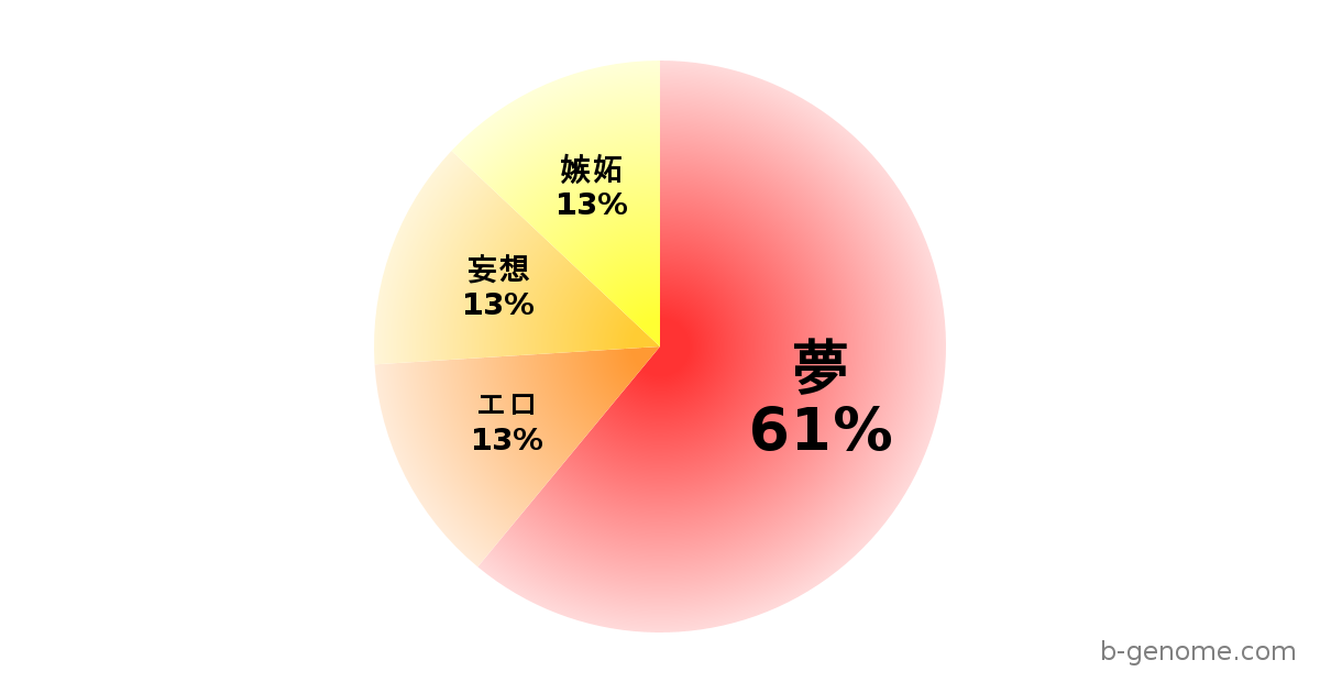 恋愛において駆け引きは不可能です。「好き」と思ったら即座に「好き!」と言ってしまうため、相手は心の準備ができずに驚きますが、その直球さに撃ち抜かれる人もいます。相手の嘘に気づけません。浮気の言い訳があまりに苦しく、「宇宙人にさらわれていた」と言われても納得しかけます。直感で恋に落ち、やがて理性で冷めます。自分の感情の変化に自分でもついていけていません。一緒にご飯を食べて「美味しいね」と言い合える、ささやかな幸せを共有できる相手を求めています。相手を試す行為が癖になっています。わざと相手を困らせて、それでも愛してくれるかを確認しないと安心できません。「推し活」や「趣味」が生き甲斐ですが、そのせいで食費がもやし中心になることもしばしば。愛があればお金はいらない、と自分に言い聞かせています。