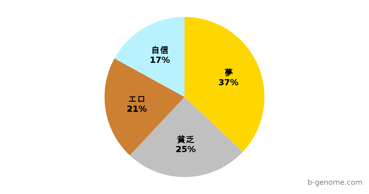 名無しさんは、何となく将来のお金に対して漠然とした不安を抱えています。日々の出費で心がザワザワしており、現実的な状況を想像力で補おうとします。細かい事実はとりあえず無視です。その場のフィーリングを重視しすぎて後から振り返り、なぜこんなことにお金を使ったんだろう、と反省を繰り返しています。心の奥底では成功を夢見ていますが、どうせ無理だろうと諦めてしまうことが多いです。なんだかんだで前向きな性格が幸いして、少しずつですが変わっていく傾向があります。