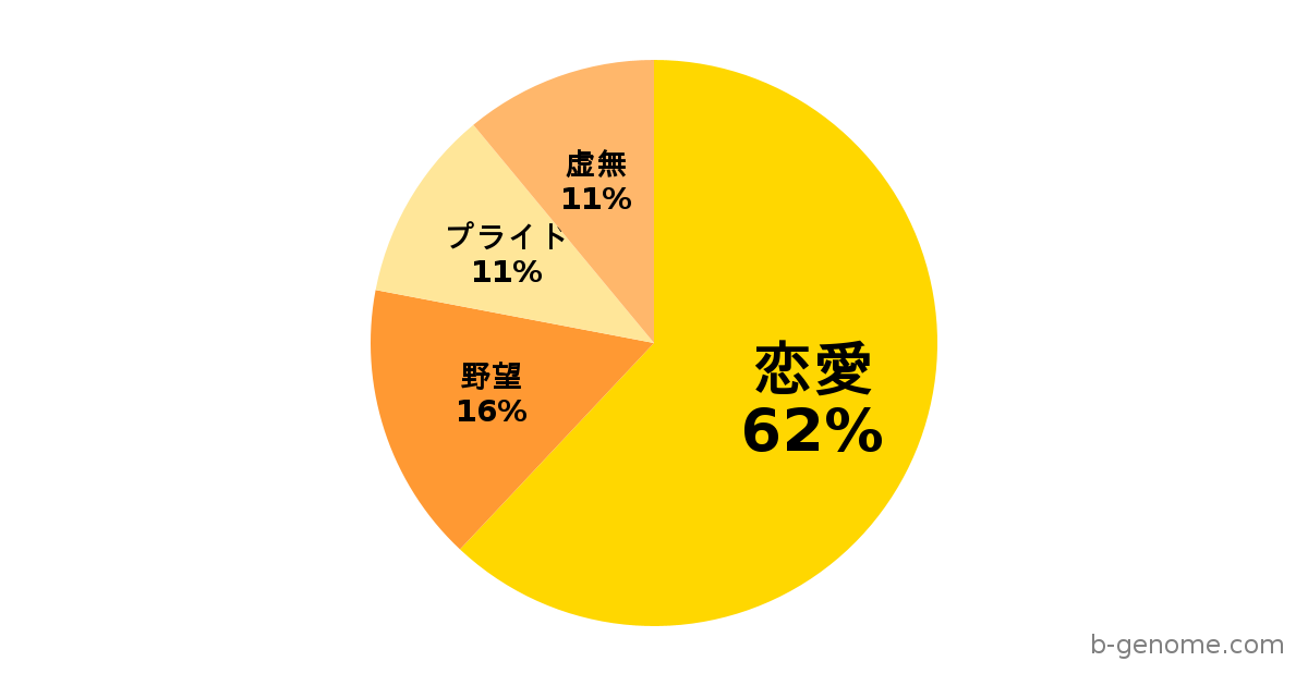 「映え」を重視します。デートコースやプレゼント選びの基準は、SNSにアップした時に「いいね」が貰えるかどうかです。ドラマや映画の影響をモロに受けており、相手への要求ハードルが急激に上がっているので現実とのギャップに幻滅している状態です。本能のままに恋をします。相手の顔が良いという理由だけで付き合い、中身が合わずに秒で別れるスピードスターです。流されやすく、強引にアプローチされると好きでもないのに断れません。結果、ダメな相手に捕まることが何度もあります。「推し活」や「趣味」が生き甲斐ですが、そのせいで食費がもやし中心になることもしばしば。愛があればお金はいらない、と自分に言い聞かせています。