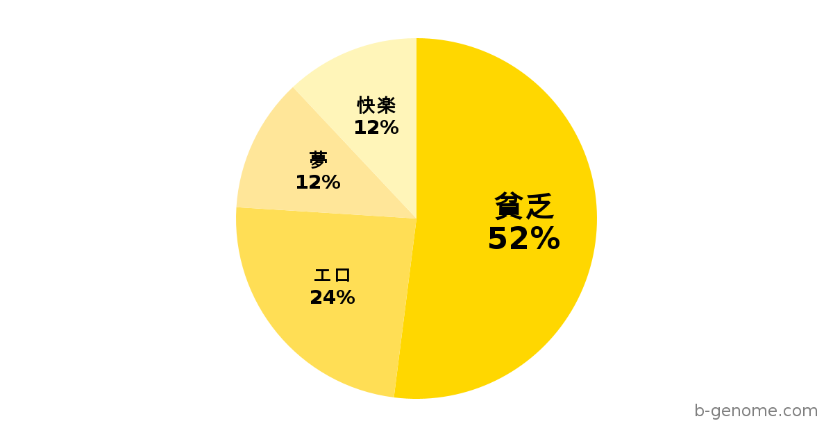 お金をかけなくても楽しめるデートを想像したり、将来の生活費を計算する癖があります。金銭面での価値観が合わないと、すぐに不満が顔に出てしまいます。お金の心配をしないで済む、穏やかで平凡な生活を望みます。デート代を割り勘にされると露骨に不機嫌になります。愛の大きさ=使える金額だと思い込んでおり、相手の経済力に依存しがちです。