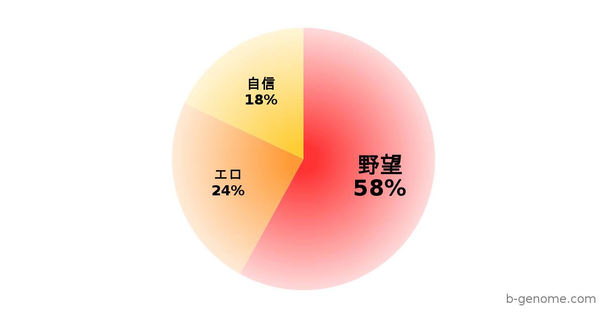 どんなに困難な状況でも、必ずどこかに突破口があると信じて疑いません。多少の紆余曲折がありながらも、納得できる形へと進める意思力があります。固定観念に縛られず、遊び心を持って仕事に取り組みます。その柔軟な発想がしばしば膠着した状況を打破します。計画段階であれこれ悩むより、現場で起きた問題にアドリブで対応していく方が得意です。ちょっとした課題や苦手なことでも脅威ではなく、自分を成長させるための良い刺激と捉えます。健全な闘争心で高みを目指します。「リボ払い」や「後払い」は、未来の自分からの借金だという感覚が麻痺しています。毎月の支払額が一定なことに安心していますが、それは終わりのない旅の始まりです。「お金がない」が口癖ですが、その割にコンビニに寄る回数は人一倍多いです。小さな浪費の積み重ねが致命傷になっています。
