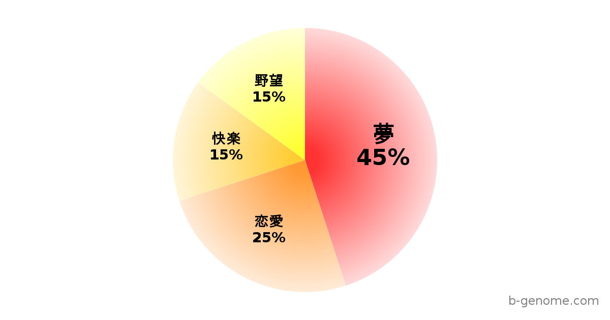 プレッシャーがかかる場面ほど燃えるタイプで、逆境において真価を発揮します。「責任は私が取る」と言える誠実さがあり、部下からの信頼は絶大です。「世界を変える」レベルのアイデアを本気で考えています。想像が現実になると本気で信じ込んでおり、不可能を可能にする力技を使います。知識や経験を振りかざしてマウントを取りたがります。「俺が若い頃は」という武勇伝語りが始まり、部下の時間を奪います。ライバルを蹴落としてでも勝ち上がろうとする競争心があります。そのハングリー精神が、?さんを強くしています。「もしも宝くじが当たったら」というシミュレーションは完璧です。使い道の内訳まで決まっていますが、肝心の宝くじは買っていないことも多いです。