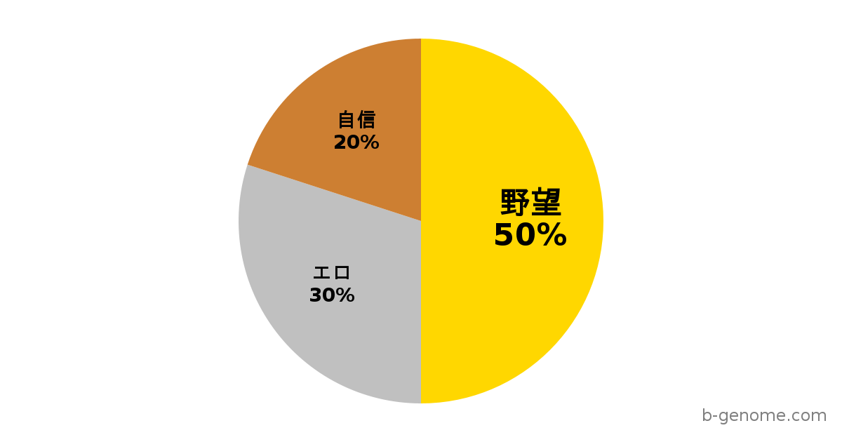 あさんは、今の自分に全く満足していません。「自分はもっと評価されるべき人間だ」という確固たる自負があり、常にワンランク上のステージへ行くチャンスを虎視眈々と狙っています。成功者の自伝やインタビューを読み、自分と重ね合わせてモチベーションを高めています。ただし、成功した後のことばかり想像して、そこに至る苦労は見ないふりをしています。意識だけは高いのですが、戦略が伴っていません。「ビッグになりたい」と叫びながら、具体的に何をするかは決まっていない、愛すべきお調子者です。未来に対して常に楽観的です。困難な目標も「楽しそうじゃん」とワクワクしながら取り組むことができます。