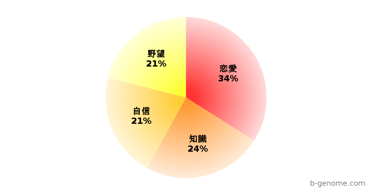 名無しさんは、日々のちょっとした欲求に抗えません。目の前の快楽を我慢することが、何よりも苦痛に感じます。頭の中で様々なことをシミュレーションして、現実での行動に活かすことができます。ついつい物事を深く考えてしまい、理想と現実のギャップに深いところで葛藤しています。その素直な欲望の根底には、自己実現をしたいという強い欲求を持っています。そして、その素直な欲求のエネルギーをポジティブに変換する強いメンタルがあります。